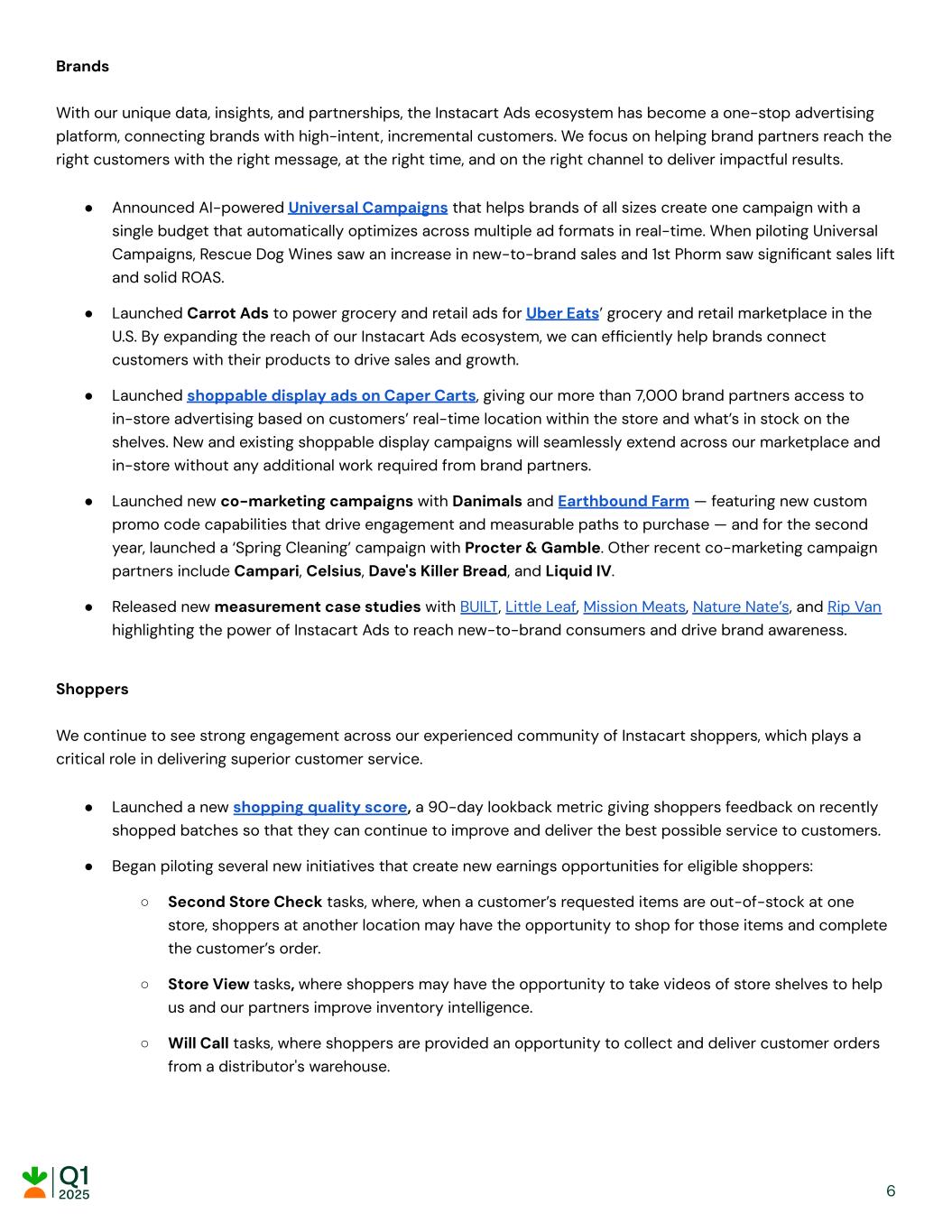 Brands With our unique data, insights, and partnerships, the Instacart Ads ecosystem has become a one-stop advertising platform, connecting brands with high-intent, incremental customers. We focus on helping brand partners reach the right customers with the right message, at the right time, and on the right channel to deliver impactful results. ● Announced AI-powered Universal Campaigns that helps brands of all sizes create one campaign with a single budget that automatically optimizes across multiple ad formats in real-time. When piloting Universal Campaigns, Rescue Dog Wines saw an increase in new-to-brand sales and 1st Phorm saw significant sales lift and solid ROAS. ● Launched Carrot Ads to power grocery and retail ads for Uber Eats’ grocery and retail marketplace in the U.S. By expanding the reach of our Instacart Ads ecosystem, we can efficiently help brands connect customers with their products to drive sales and growth. ● Launched shoppable display ads on Caper Carts, giving our more than 7,000 brand partners access to in-store advertising based on customers’ real-time location within the store and what’s in stock on the shelves. New and existing shoppable display campaigns will seamlessly extend across our marketplace and in-store without any additional work required from brand partners. ● Launched new co-marketing campaigns with Danimals and Earthbound Farm — featuring new custom promo code capabilities that drive engagement and measurable paths to purchase — and for the second year, launched a ‘Spring Cleaning’ campaign with Procter & Gamble. Other recent co-marketing campaign partners include Campari, Celsius, Dave's Killer Bread, and Liquid IV. ● Released new measurement case studies with BUILT, Little Leaf, Mission Meats, Nature Nate’s, and Rip Van highlighting the power of Instacart Ads to reach new-to-brand consumers and drive brand awareness. Shoppers We continue to see strong engagement across our experienced community of Instacart shoppers, which plays a critical role in delivering superior customer service. ● Launched a new shopping quality score, a 90-day lookback metric giving shoppers feedback on recently shopped batches so that they can continue to improve and deliver the best possible service to customers. ● Began piloting several new initiatives that create new earnings opportunities for eligible shoppers: ○ Second Store Check tasks, where, when a customer’s requested items are out-of-stock at one store, shoppers at another location may have the opportunity to shop for those items and complete the customer’s order. ○ Store View tasks, where shoppers may have the opportunity to take videos of store shelves to help us and our partners improve inventory intelligence. ○ Will Call tasks, where shoppers are provided an opportunity to collect and deliver customer orders from a distributor's warehouse. 6