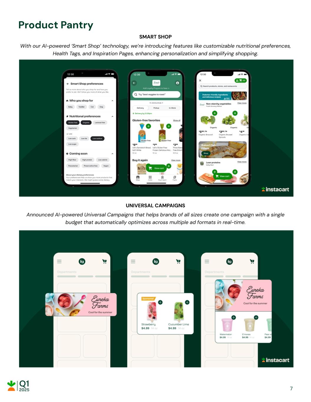 Product Pantry SMART SHOP With our AI-powered ‘Smart Shop’ technology, we’re introducing features like customizable nutritional preferences, Health Tags, and Inspiration Pages, enhancing personalization and simplifying shopping. UNIVERSAL CAMPAIGNS Announced AI-powered Universal Campaigns that helps brands of all sizes create one campaign with a single budget that automatically optimizes across multiple ad formats in real-time. 7