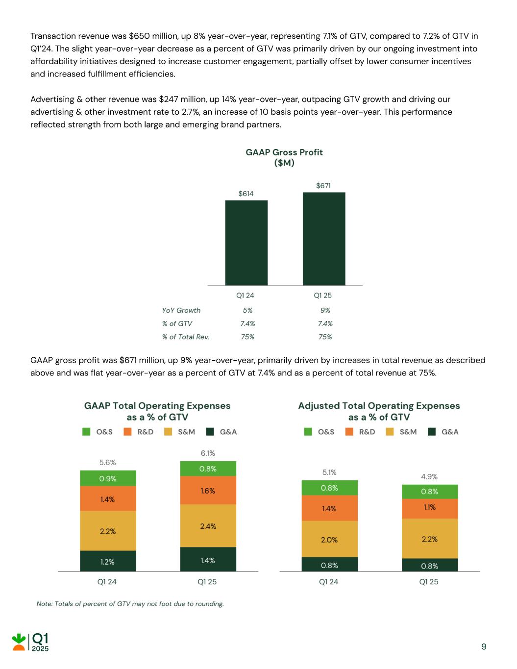 Transaction revenue was $650 million, up 8% year-over-year, representing 7.1% of GTV, compared to 7.2% of GTV in Q1’24. The slight year-over-year decrease as a percent of GTV was primarily driven by our ongoing investment into affordability initiatives designed to increase customer engagement, partially offset by lower consumer incentives and increased fulfillment efficiencies. Advertising & other revenue was $247 million, up 14% year-over-year, outpacing GTV growth and driving our advertising & other investment rate to 2.7%, an increase of 10 basis points year-over-year. This performance reflected strength from both large and emerging brand partners. GAAP gross profit was $671 million, up 9% year-over-year, primarily driven by increases in total revenue as described above and was flat year-over-year as a percent of GTV at 7.4% and as a percent of total revenue at 75%. 9