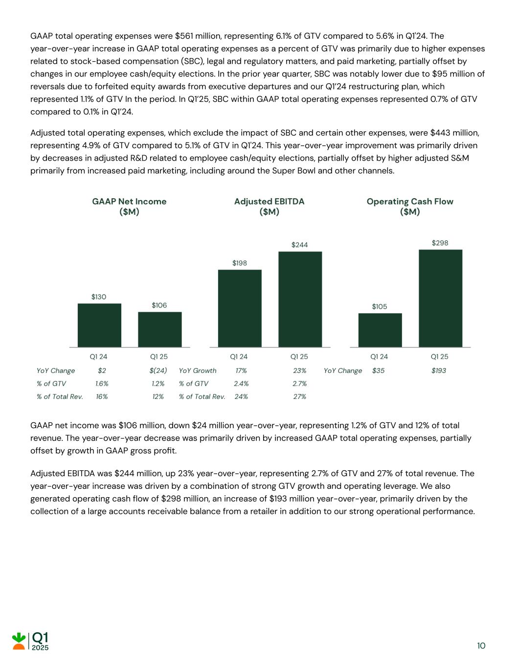 GAAP total operating expenses were $561 million, representing 6.1% of GTV compared to 5.6% in Q1'24. The year-over-year increase in GAAP total operating expenses as a percent of GTV was primarily due to higher expenses related to stock-based compensation (SBC), legal and regulatory matters, and paid marketing, partially offset by changes in our employee cash/equity elections. In the prior year quarter, SBC was notably lower due to $95 million of reversals due to forfeited equity awards from executive departures and our Q1’24 restructuring plan, which represented 1.1% of GTV In the period. In Q1’25, SBC within GAAP total operating expenses represented 0.7% of GTV compared to 0.1% in Q1’24. Adjusted total operating expenses, which exclude the impact of SBC and certain other expenses, were $443 million, representing 4.9% of GTV compared to 5.1% of GTV in Q1'24. This year-over-year improvement was primarily driven by decreases in adjusted R&D related to employee cash/equity elections, partially offset by higher adjusted S&M primarily from increased paid marketing, including around the Super Bowl and other channels. GAAP net income was $106 million, down $24 million year-over-year, representing 1.2% of GTV and 12% of total revenue. The year-over-year decrease was primarily driven by increased GAAP total operating expenses, partially offset by growth in GAAP gross profit. Adjusted EBITDA was $244 million, up 23% year-over-year, representing 2.7% of GTV and 27% of total revenue. The year-over-year increase was driven by a combination of strong GTV growth and operating leverage. We also generated operating cash flow of $298 million, an increase of $193 million year-over-year, primarily driven by the collection of a large accounts receivable balance from a retailer in addition to our strong operational performance. 10