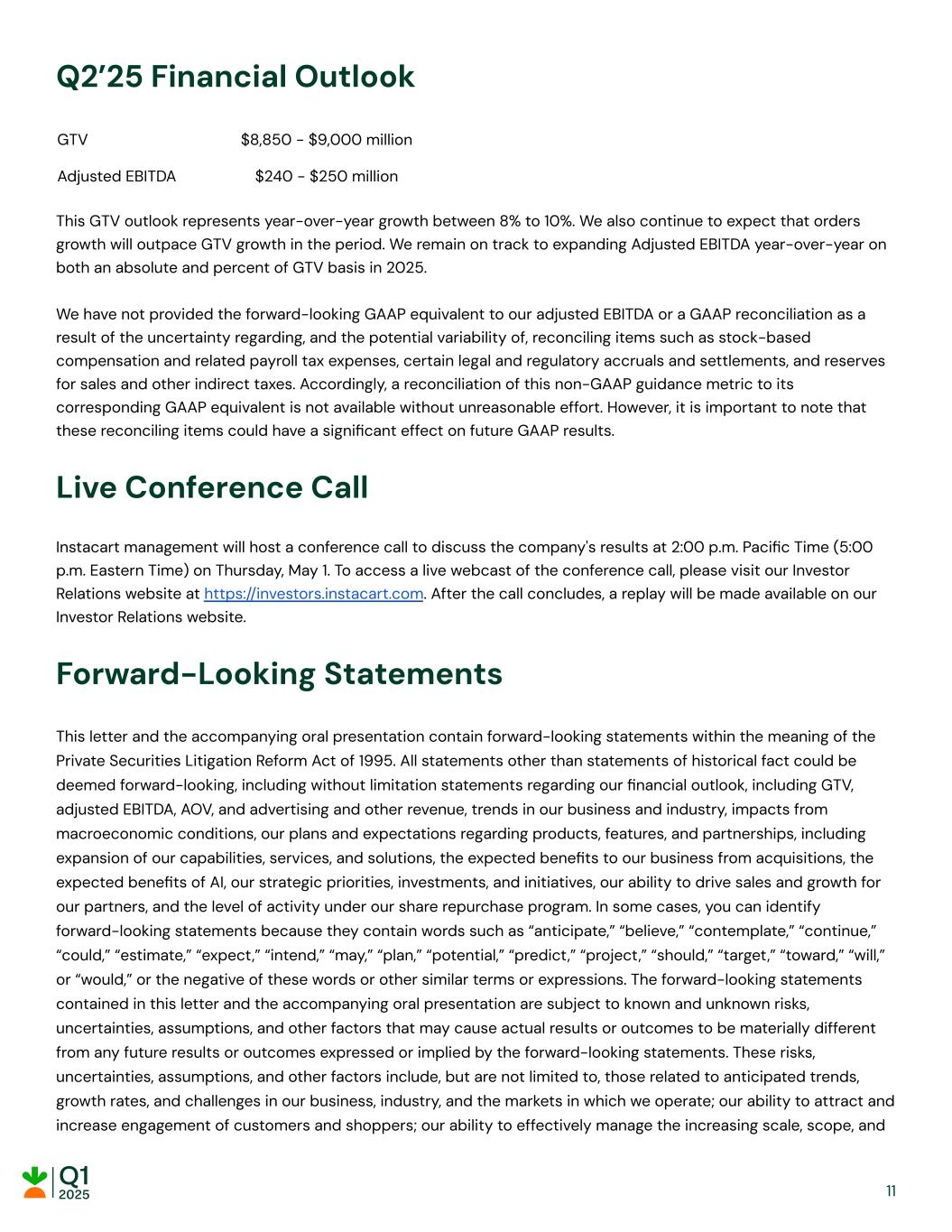 Q2’25 Financial Outlook GTV $8,850 - $9,000 million Adjusted EBITDA $240 - $250 million This GTV outlook represents year-over-year growth between 8% to 10%. We also continue to expect that orders growth will outpace GTV growth in the period. We remain on track to expanding Adjusted EBITDA year-over-year on both an absolute and percent of GTV basis in 2025. We have not provided the forward-looking GAAP equivalent to our adjusted EBITDA or a GAAP reconciliation as a result of the uncertainty regarding, and the potential variability of, reconciling items such as stock-based compensation and related payroll tax expenses, certain legal and regulatory accruals and settlements, and reserves for sales and other indirect taxes. Accordingly, a reconciliation of this non-GAAP guidance metric to its corresponding GAAP equivalent is not available without unreasonable effort. However, it is important to note that these reconciling items could have a significant effect on future GAAP results. Live Conference Call Instacart management will host a conference call to discuss the company's results at 2:00 p.m. Pacific Time (5:00 p.m. Eastern Time) on Thursday, May 1. To access a live webcast of the conference call, please visit our Investor Relations website at https://investors.instacart.com. After the call concludes, a replay will be made available on our Investor Relations website. Forward-Looking Statements This letter and the accompanying oral presentation contain forward-looking statements within the meaning of the Private Securities Litigation Reform Act of 1995. All statements other than statements of historical fact could be deemed forward-looking, including without limitation statements regarding our financial outlook, including GTV, adjusted EBITDA, AOV, and advertising and other revenue, trends in our business and industry, impacts from macroeconomic conditions, our plans and expectations regarding products, features, and partnerships, including expansion of our capabilities, services, and solutions, the expected benefits to our business from acquisitions, the expected benefits of AI, our strategic priorities, investments, and initiatives, our ability to drive sales and growth for our partners, and the level of activity under our share repurchase program. In some cases, you can identify forward-looking statements because they contain words such as “anticipate,” “believe,” “contemplate,” “continue,” “could,” “estimate,” “expect,” “intend,” “may,” “plan,” “potential,” “predict,” “project,” “should,” “target,” “toward,” “will,” or “would,” or the negative of these words or other similar terms or expressions. The forward-looking statements contained in this letter and the accompanying oral presentation are subject to known and unknown risks, uncertainties, assumptions, and other factors that may cause actual results or outcomes to be materially different from any future results or outcomes expressed or implied by the forward-looking statements. These risks, uncertainties, assumptions, and other factors include, but are not limited to, those related to anticipated trends, growth rates, and challenges in our business, industry, and the markets in which we operate; our ability to attract and increase engagement of customers and shoppers; our ability to effectively manage the increasing scale, scope, and 11