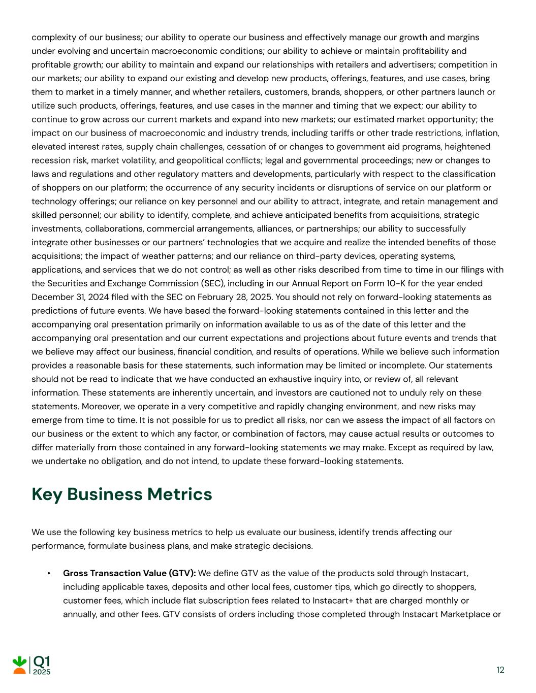 complexity of our business; our ability to operate our business and effectively manage our growth and margins under evolving and uncertain macroeconomic conditions; our ability to achieve or maintain profitability and profitable growth; our ability to maintain and expand our relationships with retailers and advertisers; competition in our markets; our ability to expand our existing and develop new products, offerings, features, and use cases, bring them to market in a timely manner, and whether retailers, customers, brands, shoppers, or other partners launch or utilize such products, offerings, features, and use cases in the manner and timing that we expect; our ability to continue to grow across our current markets and expand into new markets; our estimated market opportunity; the impact on our business of macroeconomic and industry trends, including tariffs or other trade restrictions, inflation, elevated interest rates, supply chain challenges, cessation of or changes to government aid programs, heightened recession risk, market volatility, and geopolitical conflicts; legal and governmental proceedings; new or changes to laws and regulations and other regulatory matters and developments, particularly with respect to the classification of shoppers on our platform; the occurrence of any security incidents or disruptions of service on our platform or technology offerings; our reliance on key personnel and our ability to attract, integrate, and retain management and skilled personnel; our ability to identify, complete, and achieve anticipated benefits from acquisitions, strategic investments, collaborations, commercial arrangements, alliances, or partnerships; our ability to successfully integrate other businesses or our partners’ technologies that we acquire and realize the intended benefits of those acquisitions; the impact of weather patterns; and our reliance on third-party devices, operating systems, applications, and services that we do not control; as well as other risks described from time to time in our filings with the Securities and Exchange Commission (SEC), including in our Annual Report on Form 10-K for the year ended December 31, 2024 filed with the SEC on February 28, 2025. You should not rely on forward-looking statements as predictions of future events. We have based the forward-looking statements contained in this letter and the accompanying oral presentation primarily on information available to us as of the date of this letter and the accompanying oral presentation and our current expectations and projections about future events and trends that we believe may affect our business, financial condition, and results of operations. While we believe such information provides a reasonable basis for these statements, such information may be limited or incomplete. Our statements should not be read to indicate that we have conducted an exhaustive inquiry into, or review of, all relevant information. These statements are inherently uncertain, and investors are cautioned not to unduly rely on these statements. Moreover, we operate in a very competitive and rapidly changing environment, and new risks may emerge from time to time. It is not possible for us to predict all risks, nor can we assess the impact of all factors on our business or the extent to which any factor, or combination of factors, may cause actual results or outcomes to differ materially from those contained in any forward-looking statements we may make. Except as required by law, we undertake no obligation, and do not intend, to update these forward-looking statements. Key Business Metrics We use the following key business metrics to help us evaluate our business, identify trends affecting our performance, formulate business plans, and make strategic decisions. • Gross Transaction Value (GTV): We define GTV as the value of the products sold through Instacart, including applicable taxes, deposits and other local fees, customer tips, which go directly to shoppers, customer fees, which include flat subscription fees related to Instacart+ that are charged monthly or annually, and other fees. GTV consists of orders including those completed through Instacart Marketplace or 12