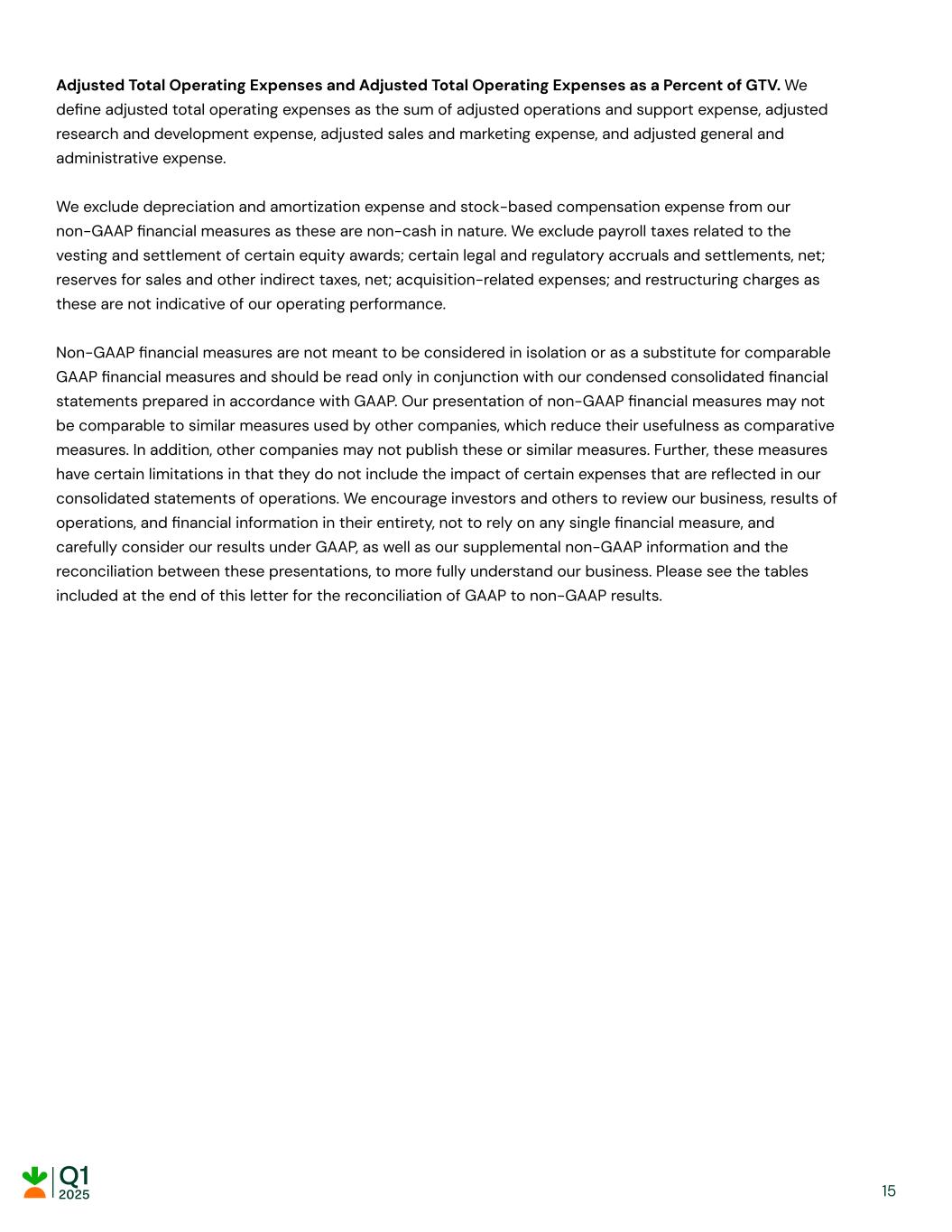 Adjusted Total Operating Expenses and Adjusted Total Operating Expenses as a Percent of GTV. We define adjusted total operating expenses as the sum of adjusted operations and support expense, adjusted research and development expense, adjusted sales and marketing expense, and adjusted general and administrative expense. We exclude depreciation and amortization expense and stock-based compensation expense from our non-GAAP financial measures as these are non-cash in nature. We exclude payroll taxes related to the vesting and settlement of certain equity awards; certain legal and regulatory accruals and settlements, net; reserves for sales and other indirect taxes, net; acquisition-related expenses; and restructuring charges as these are not indicative of our operating performance. Non-GAAP financial measures are not meant to be considered in isolation or as a substitute for comparable GAAP financial measures and should be read only in conjunction with our condensed consolidated financial statements prepared in accordance with GAAP. Our presentation of non-GAAP financial measures may not be comparable to similar measures used by other companies, which reduce their usefulness as comparative measures. In addition, other companies may not publish these or similar measures. Further, these measures have certain limitations in that they do not include the impact of certain expenses that are reflected in our consolidated statements of operations. We encourage investors and others to review our business, results of operations, and financial information in their entirety, not to rely on any single financial measure, and carefully consider our results under GAAP, as well as our supplemental non-GAAP information and the reconciliation between these presentations, to more fully understand our business. Please see the tables included at the end of this letter for the reconciliation of GAAP to non-GAAP results. 15