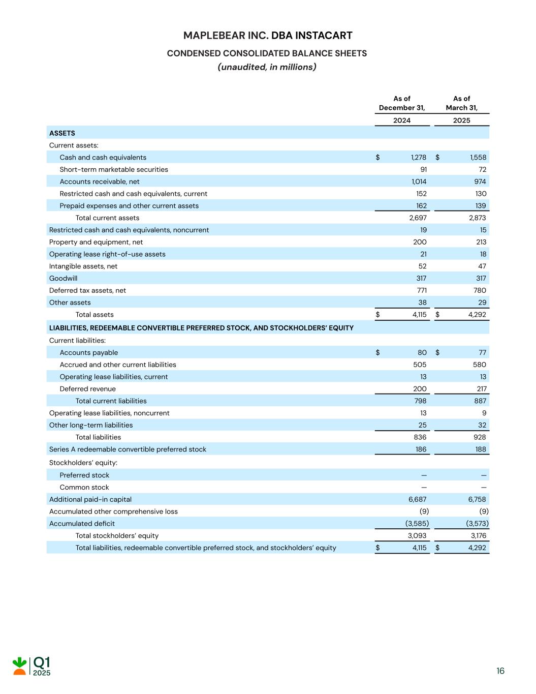 MAPLEBEAR INC. DBA INSTACART CONDENSED CONSOLIDATED BALANCE SHEETS (unaudited, in millions) As of December 31, As of March 31, 2024 2025 ASSETS Current assets: Cash and cash equivalents $ 1,278 $ 1,558 Short-term marketable securities 91 72 Accounts receivable, net 1,014 974 Restricted cash and cash equivalents, current 152 130 Prepaid expenses and other current assets 162 139 Total current assets 2,697 2,873 Restricted cash and cash equivalents, noncurrent 19 15 Property and equipment, net 200 213 Operating lease right-of-use assets 21 18 Intangible assets, net 52 47 Goodwill 317 317 Deferred tax assets, net 771 780 Other assets 38 29 Total assets $ 4,115 $ 4,292 LIABILITIES, REDEEMABLE CONVERTIBLE PREFERRED STOCK, AND STOCKHOLDERS’ EQUITY Current liabilities: Accounts payable $ 80 $ 77 Accrued and other current liabilities 505 580 Operating lease liabilities, current 13 13 Deferred revenue 200 217 Total current liabilities 798 887 Operating lease liabilities, noncurrent 13 9 Other long-term liabilities 25 32 Total liabilities 836 928 Series A redeemable convertible preferred stock 186 188 Stockholders’ equity: Preferred stock — — Common stock — — Additional paid-in capital 6,687 6,758 Accumulated other comprehensive loss (9) (9) Accumulated deficit (3,585) (3,573) Total stockholders’ equity 3,093 3,176 Total liabilities, redeemable convertible preferred stock, and stockholders’ equity $ 4,115 $ 4,292 16