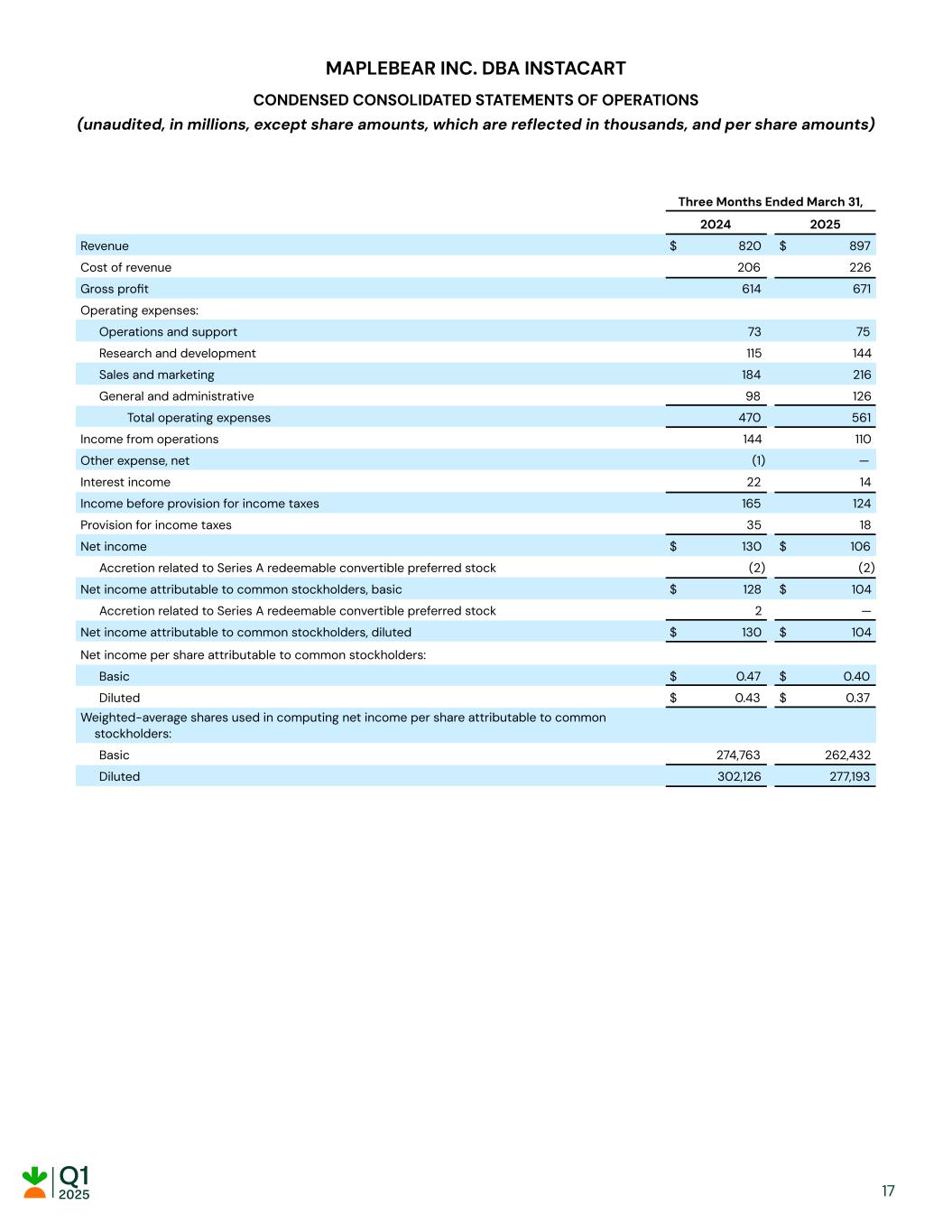 MAPLEBEAR INC. DBA INSTACART CONDENSED CONSOLIDATED STATEMENTS OF OPERATIONS (unaudited, in millions, except share amounts, which are reflected in thousands, and per share amounts) Three Months Ended March 31, 2024 2025 Revenue $ 820 $ 897 Cost of revenue 206 226 Gross profit 614 671 Operating expenses: Operations and support 73 75 Research and development 115 144 Sales and marketing 184 216 General and administrative 98 126 Total operating expenses 470 561 Income from operations 144 110 Other expense, net (1) — Interest income 22 14 Income before provision for income taxes 165 124 Provision for income taxes 35 18 Net income $ 130 $ 106 Accretion related to Series A redeemable convertible preferred stock (2) (2) Net income attributable to common stockholders, basic $ 128 $ 104 Accretion related to Series A redeemable convertible preferred stock 2 — Net income attributable to common stockholders, diluted $ 130 $ 104 Net income per share attributable to common stockholders: Basic $ 0.47 $ 0.40 Diluted $ 0.43 $ 0.37 Weighted-average shares used in computing net income per share attributable to common stockholders: Basic 274,763 262,432 Diluted 302,126 277,193 17