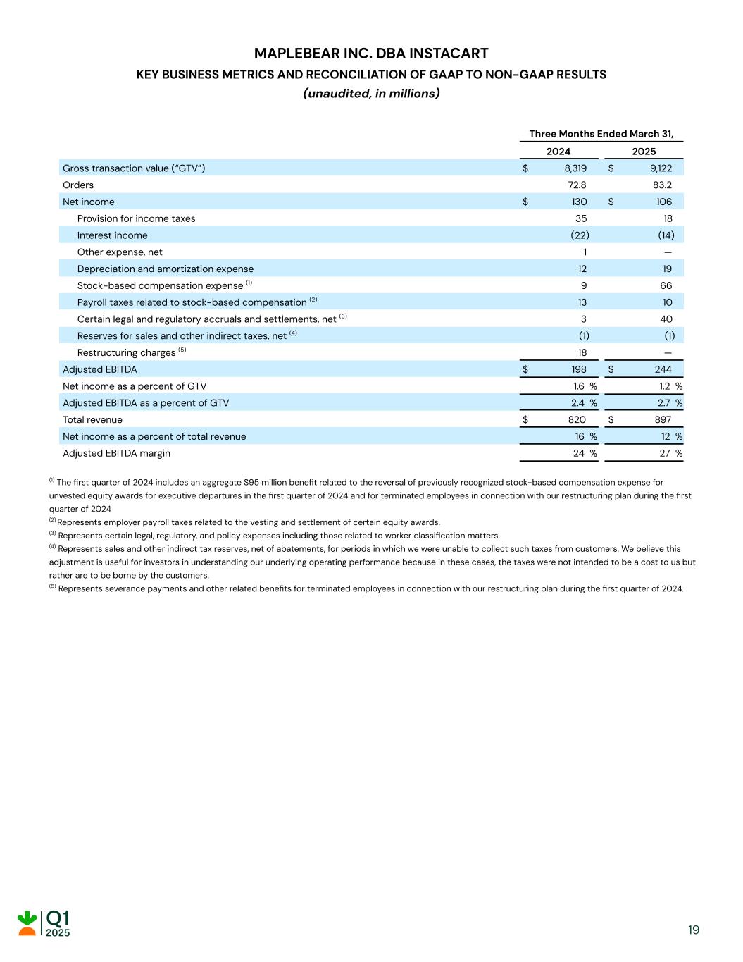 MAPLEBEAR INC. DBA INSTACART KEY BUSINESS METRICS AND RECONCILIATION OF GAAP TO NON-GAAP RESULTS (unaudited, in millions) Three Months Ended March 31, 2024 2025 Gross transaction value (“GTV”) $ 8,319 $ 9,122 Orders 72.8 83.2 Net income $ 130 $ 106 Provision for income taxes 35 18 Interest income (22) (14) Other expense, net 1 — Depreciation and amortization expense 12 19 Stock-based compensation expense (1) 9 66 Payroll taxes related to stock-based compensation (2) 13 10 Certain legal and regulatory accruals and settlements, net (3) 3 40 Reserves for sales and other indirect taxes, net (4) (1) (1) Restructuring charges (5) 18 — Adjusted EBITDA $ 198 $ 244 Net income as a percent of GTV 1.6 % 1.2 % Adjusted EBITDA as a percent of GTV 2.4 % 2.7 % Total revenue $ 820 $ 897 Net income as a percent of total revenue 16 % 12 % Adjusted EBITDA margin 24 % 27 % (1) The first quarter of 2024 includes an aggregate $95 million benefit related to the reversal of previously recognized stock-based compensation expense for unvested equity awards for executive departures in the first quarter of 2024 and for terminated employees in connection with our restructuring plan during the first quarter of 2024 (2) Represents employer payroll taxes related to the vesting and settlement of certain equity awards. (3) Represents certain legal, regulatory, and policy expenses including those related to worker classification matters. (4) Represents sales and other indirect tax reserves, net of abatements, for periods in which we were unable to collect such taxes from customers. We believe this adjustment is useful for investors in understanding our underlying operating performance because in these cases, the taxes were not intended to be a cost to us but rather are to be borne by the customers. (5) Represents severance payments and other related benefits for terminated employees in connection with our restructuring plan during the first quarter of 2024. 19